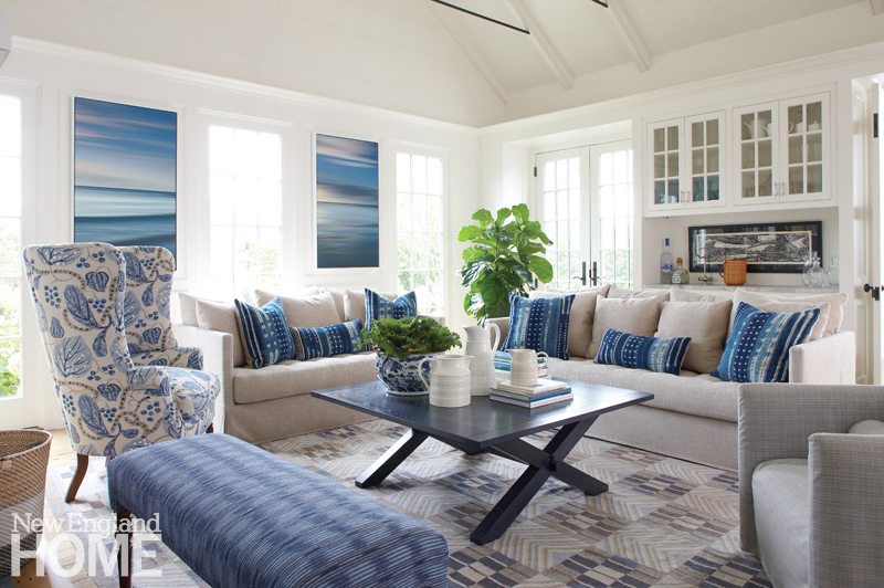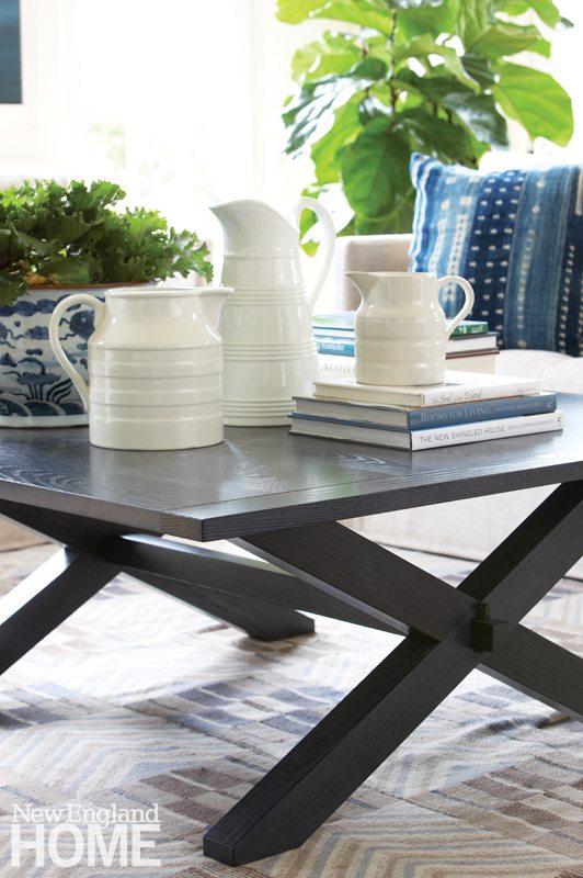Nancy and Joe Serafini’s Nantucket home is not always perfect. On sunny days when there’s not a New England Home photo shoot going on, the pillows on the sofas are smooshed into cozy submission by the couple’s grown children and their spouses. One of the antique ironstone pitchers decorating the large coffee table may be at the end of a grandchild’s foot as he clomps about, shrieking with delight at his own cleverness. Tony, the couple’s Wheaten Terrier, may be trolling the floor around the kitchen island for Cheerios flung by grandchildren too adorable to scold.