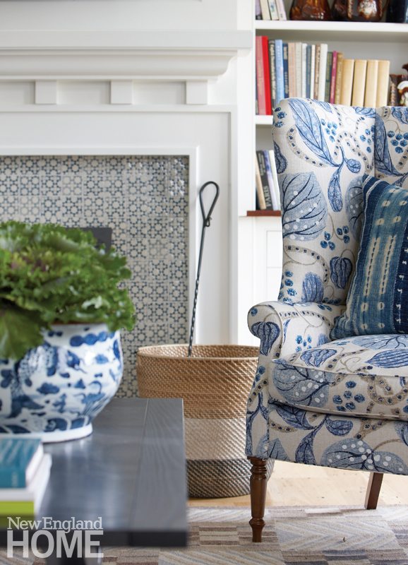 Favorite shades of blue pop up in the William Yeoward print on the wing chairs in the living room as well as in the J.D. Staron rug and the sofa’s Dransfield & Ross pillows.