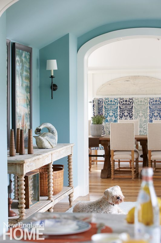 A striped linen fabric from Raoul that covers a high-backed bench in the dining room helps broaden the palette, adding oatmeal and green to the blues.