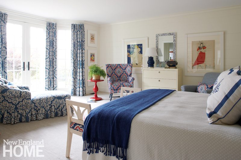 The color scheme changes a bit in the master bedroom, where a pair of Toulouse-Lautrec posters that her father, a B-17 pilot, purchased right after World War II, inspired a red, white, and blue theme. “The posters were a driving force behind the design,” Nancy says. “They’re a remembrance of my mother and father.”