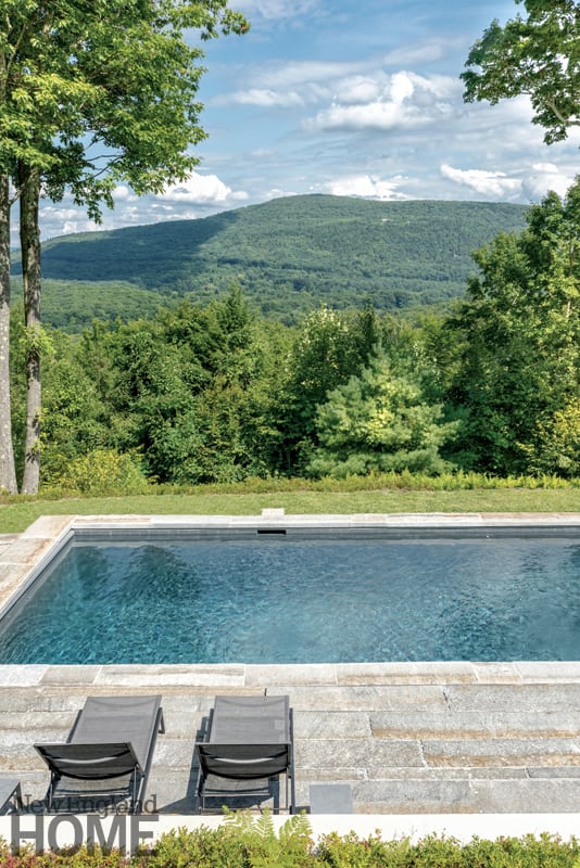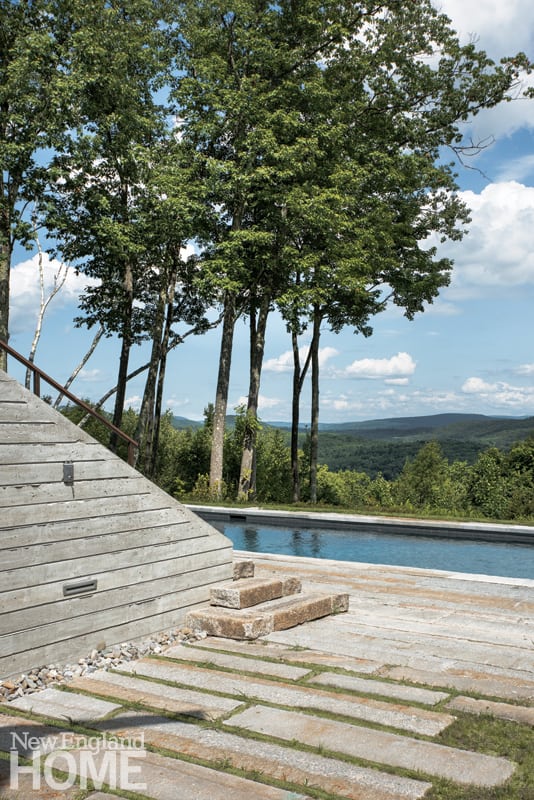 A series of board-formed concrete retaining walls with slopes of tough native plants, like lowbush blueberry and hay-scented fern—installed by Ingersoll Land Care—provide dramatic textured terraces that respond to the home’s horizontal forms. “The views from inside the house were as important as those outside,” says Cunningham. “We lowered the upper terrace about thirty inches to prevent the outdoor furniture from blocking the scene and to give a better sense of scale and drama.” A black and stainless-steel crib holds wood for the terrace’s fire pit. Not just utilitarian, according to Cunningham, the crib builds on the romantic Berkshire vernacular of gathering around a blazing bonfire.