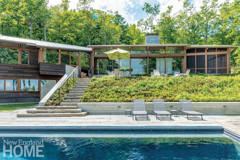 A Berkshires home cozies into its hillside site with a landscape plan that looks as though it was created by Mother Nature herself.