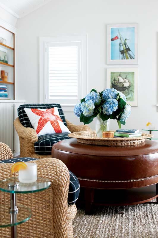 Here, across from the kitchen, four woven water-hyacinth chairs gather around a generous leather ottoman, which Kathleen designed to accommodate pairs of resting feet or a tray for drinks and snacks, with a shelf underneath for storage. The vaulted ceiling and strategically placed windows allow copious amounts of afternoon light to filter into the space, where plush black-and-white seat cushions invite lingering. Ship-inspired intaglios—Thar She Blows and The Flying Dutchman by Nantucket artist Janet Ball—hang on the wall, adding the blues and greens of sky and sea; a life-jacket-orange starfish printed on a crisp white pillow brings in another bright pop of color.
