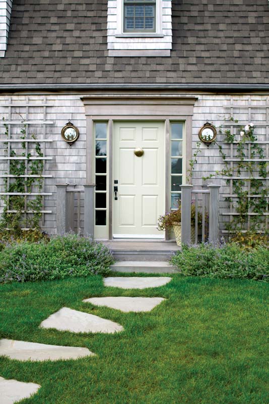 Two bedrooms, each with an en-suite bath and set of French doors that open onto the lawn, now occupy the first floor. The master bedroom features a king-size bed with a custom headboard that fits perfectly beneath a picture window. The second room maintains a simple gray-and-white scheme, but, according to Kathleen, all the important elements are accounted for: “A guest room should have a comfortable bed, enough pillows and good light to read by.”