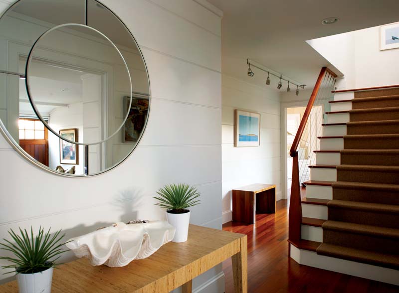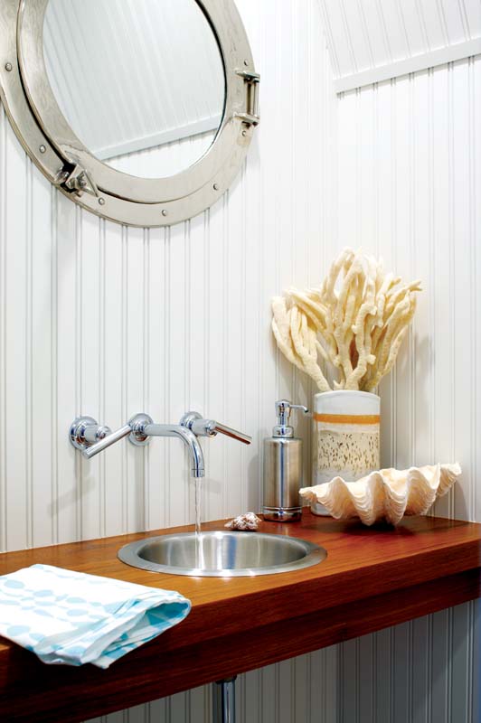 Custom built-ins—tucked into walls, hidden under beds, doubling as furniture—provide plenty of storage and minimize clutter throughout the 1,700-square-foot house. Polished teak floors gleam like a freshly scrubbed deck, and Roman shades unfurl like sailcloth. Other nods to oceangoing vessels include a porthole mirror in the upstairs powder room, beadboard walls and a new teak staircase that evokes a ship ladder with its stainless-steel horizontal balustrades.