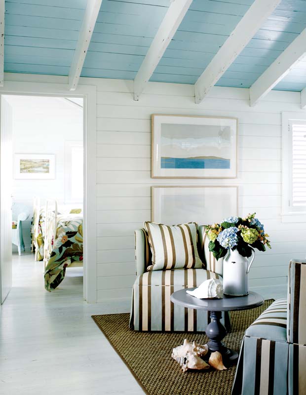 Renovations continued in the property’s two-room cabin, where floors are a pickled white oak and formerly exposed walls now wear white horizontal V-groove paneling. White beams intersect a pale seaglass-blue ceiling, giving the entire space a cool feel on hot summer days. A new outdoor shower gets plenty of use from family and guests.
