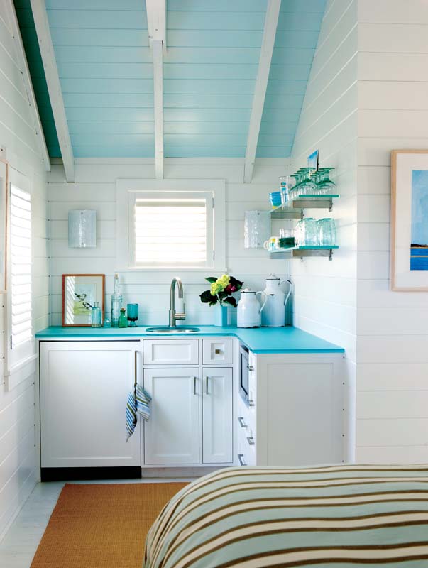 Because the room’s sharply angled walls and white V-groove ceiling mimic the gambrel roofline, all of the kitchen cabinetry and appliances—including refrigerator and freezer—had to fit below counter level. The pristine white cabinetry, which Kathleen designed without stiles and rails, fits seamlessly into the space, with simple polished-nickel hardware to maintain the streamlined look. Along the angled walls, small floating shelves made of wood and glass hang suspended by thin metal cables, as if on a ship.