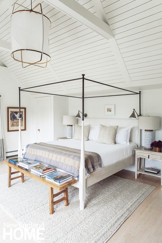 Upstairs, the couple’s bedroom is a peaceful aerie with a cathedral ceiling lined in white planks. A custom canopy bed melds Shaker and industrial flavor, while a Belgian-linen-upholstered armchair coupled with a midcentury rattan ottoman lend European flair. Casey infused the nursery with similar notes of playful sophistication using tone-on-tone wallpaper with finely drawn elephants, a contemporary crib, and a statement pendant light.