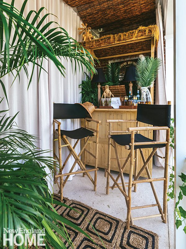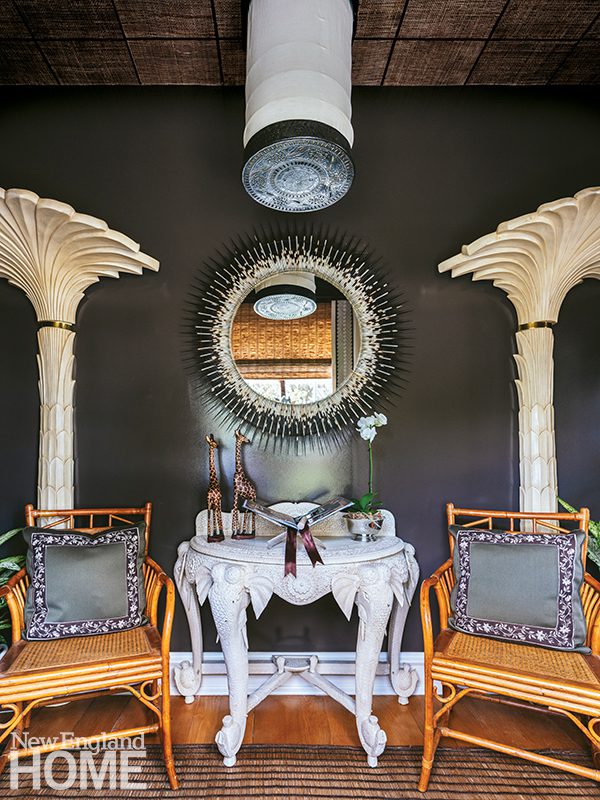The design team at Kristin Paton Interiors cleverly met the challenge of decorating a pair of unusual spaces, transforming a primary closet into a dressing room (The Jewel of the Nile) and an adjoining balcony into a bar (The Gentleman of the Jungle). Paton settled on a British West Indies feel. “I’m familiar with antiques of the period, and the style is one I very much relate to,” she says. The Boston designer describes her vision: “The lady of the house puts on her jewels, while her partner takes in views of the Intracoastal as they prepare for a night on the town.”