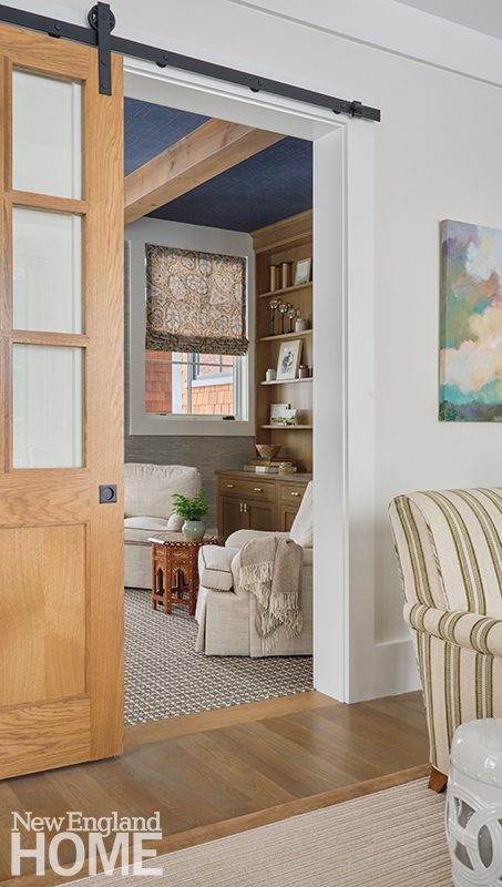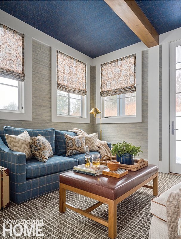 Elsewhere, blue makes an appearance, most notably in the charming room everyone has taken to calling the “cozy den,” where the ceiling sports a Phillip Jeffries grasscloth in a spunky denim blue.