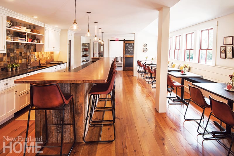 The property, which now boasts ten luxury rooms and an astounding ninety-three windows, had sat empty for four years and needed some major TLC before it could open to the public. Patty describes her style as “vernacular, rural, northern New England,” and admits that she isn’t a purist when it comes to the space, which was originally the home of Daniel Pickering, who opened the first bank in Wolfeboro. (Coincidentally, he also built a long-gone 240-room hotel across the street from his home.) You won’t find any floral wallpaper, but you will find bathrooms with heated floors, wainscoting crafted from boards found in the barn, floor coverings from Dash & Albert, a gathering kitchen where chefs cook breakfast each morning, and a library with original woodwork that has never been painted. There’s also a barn (complete with haylofts) where the inn hosts events including tasting dinners and innkeeper suppers. As for those aforementioned ninety-three windows? Eight are restored originals.
