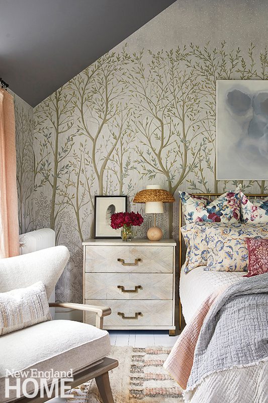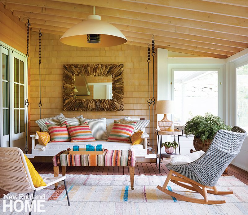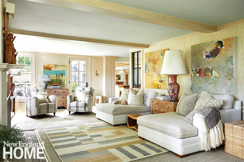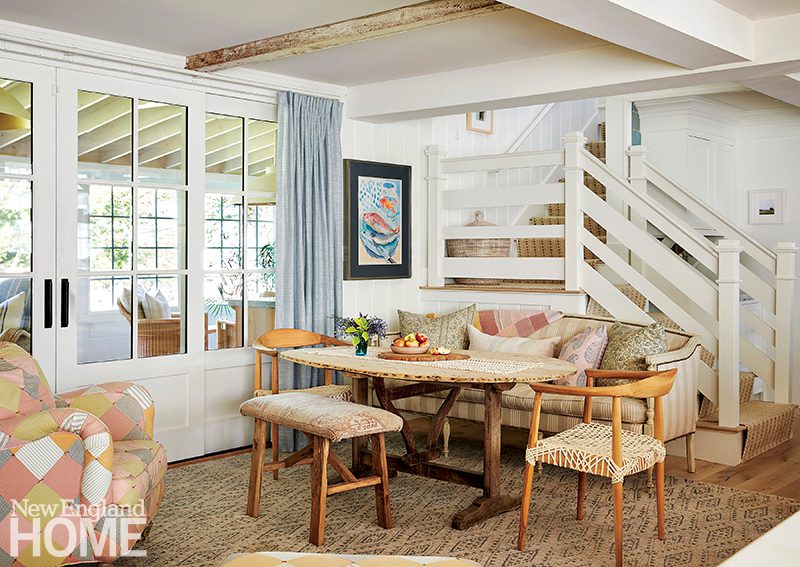 Inside, she remembers, “There was a lot of plaster and paint. So, we replaced it with V-groove and painted everything white.” Manganello then complemented the brightened interiors with light woods and a pale upholstery palette. “Somehow, I’ve evolved into loving pink,” she says with some surprise. “In Maine, everyone likes blue-and-white or beige-beige-beige, so I’m playing with a different tone.”