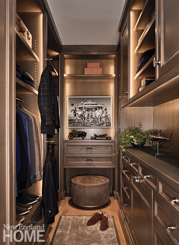 While designing their previous apartment in 2020, and a Martha’s Vineyard getaway soon after, Hogarty says she learned that the Napolis love sophisticated, quiet luxury. “They’re not label driven,” she notes, “but they’re impressed by quality.” That led her to use sumptuous materials, custom furnishings, and the sort of thoughtful, space-enhancing details for which her firm is known. Consider the wine cellar alcove. It stylishly houses nearly 400 bottles and scores of cigars in its soapstone–topped cabinetry, and it sports a leather-wrapped panel hung with a commissioned work by artist Erik Skoldberg.