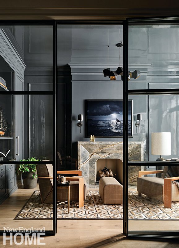 Those pushes resulted in some spectacular moments: a library painted a high-gloss violet-tinged black shade that’s almost mirror like, moldings and ceiling included; a water-view living room crowned by a swooping leather-and-crystal light fixture.