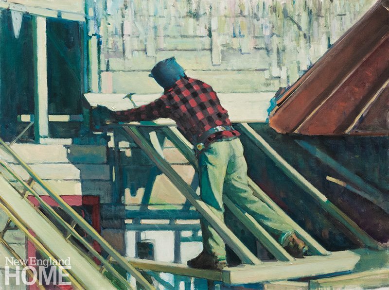 Beyond technique lies art. Whiting’s muscularity, his majestic perspectives in incomparably rich, slow-drying oils, as opposed to acrylics, bring the Vineyard’s twilit, off-season towns and its romantic coastlines aproned by sun-dappled dunes to life. You’d have to go back to Albert Bierstadt and other mid-nineteenth-century luminists for equal scope. Whiting’s workmen and fishermen are just as vital, and even, at times, heroic. The laboring man in New Roof, for example, shares a distinct kinship with the strapping figures of Thomas Hart Benton.