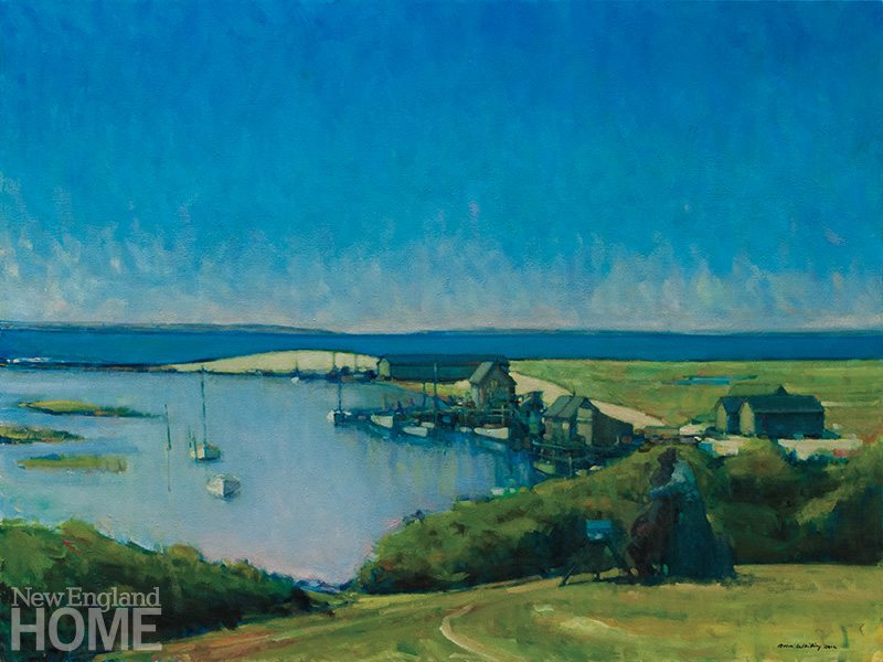 Interior designer Mary Rentschler is a fellow islander and Whiting fan. “I have a client who is a high-powered lawyer in Washington, D.C.,” she says. “He has one of Allen’s oils in his office, that shows oystering in Chilmark. He says it works like a relief valve in his airless city tower, allowing him to take a breath.”