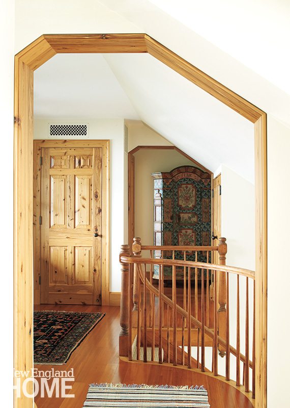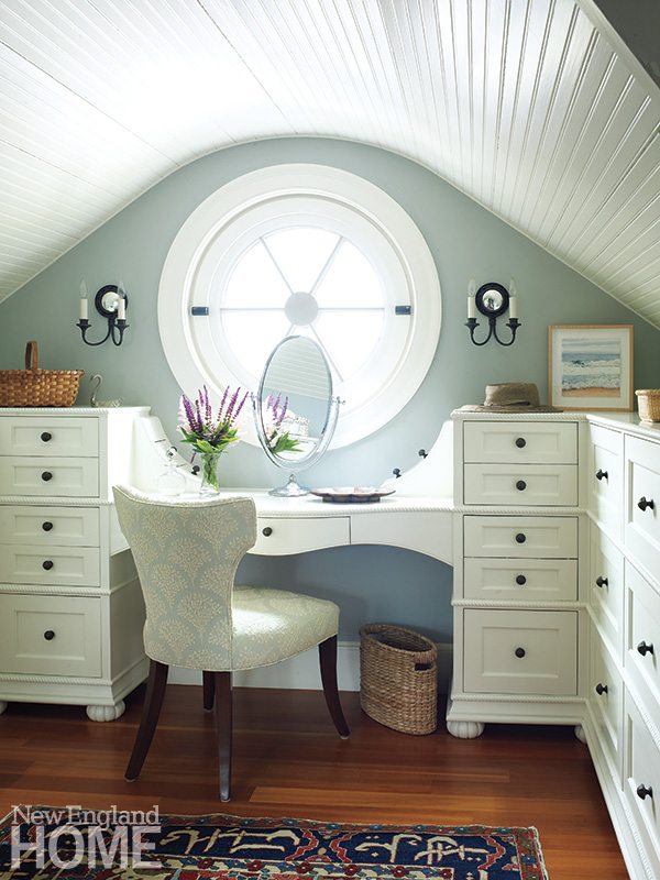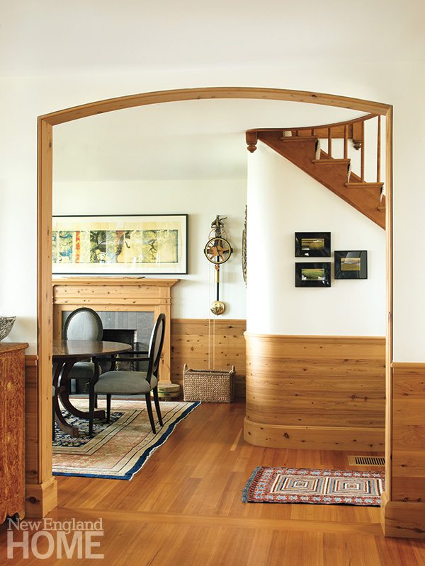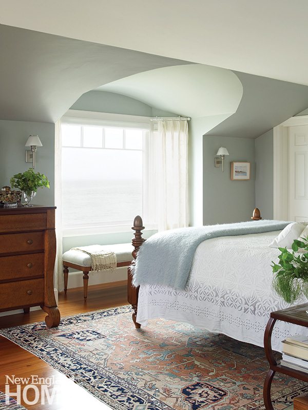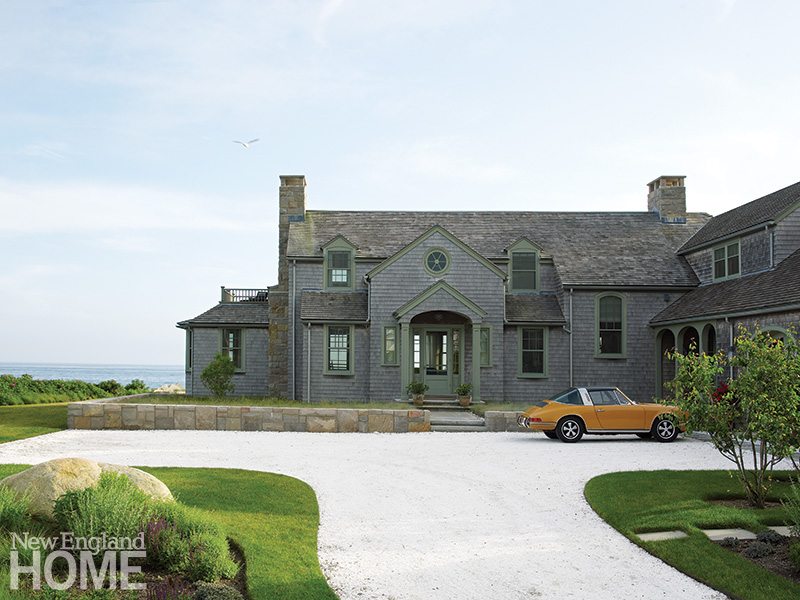 Penniman moved the house fifteen feet back from the water, giving it a new foundation and rotating it slightly to increase the already substantial views. Working with builder Stephen Morgan, he created a new wing that connects to the house at a 90-degree angle. The addition, which holds a mudroom, sitting room, studio area, garage, and a second-floor guest room, helps to create a courtyard in front of the house. “Steve was so good about working with the existing structure,” says Penniman. “He understands the way older houses are built. It’s not a reproduction. He worked with existing architecture to look authentic.”