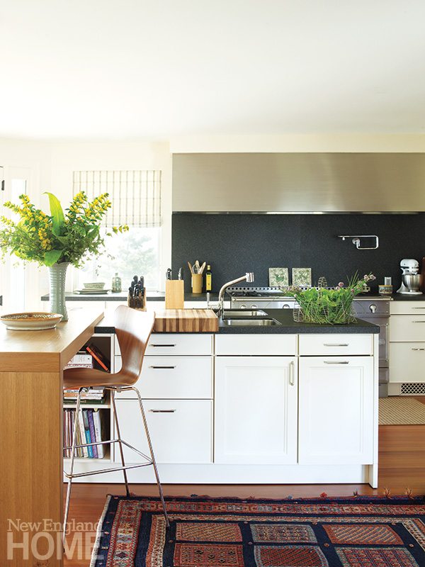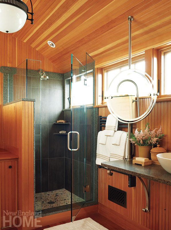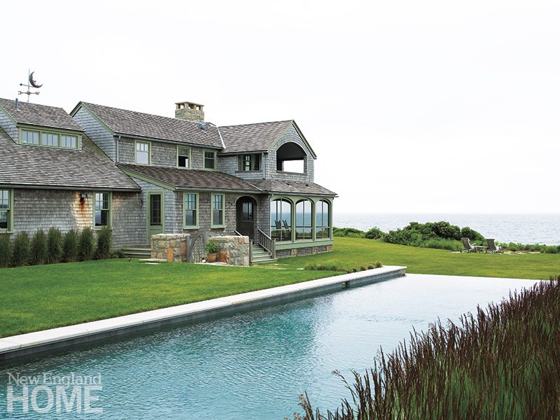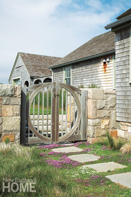 A narrow drive defines the approach to the house and meanders toward a raised-bed vegetable garden before entering the courtyard. Landscape architect Anne Penniman approached the site with as much care as her architect husband. “Preservation of the house was so important to us,” she says. In placing the pool, for example, Anne chose a spot behind the new garage. Sheltered by the thicket, as well as by blueberry bushes and other shrubs, the area made a perfect spot. “It has a great view, but it’s also protected,” she says. “We wanted to protect the privacy and sanctity of the house.”