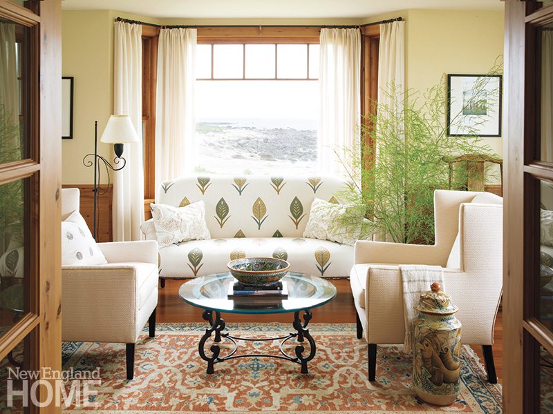 In the adjacent morning room, a smaller sitting area that faces the rising sun, clean-lined white wingback chairs in a cream-colored fabric are paired with a crewel-patterned sofa and a richly detailed antique rug. Soft sheers filter the light streaming through the windows.