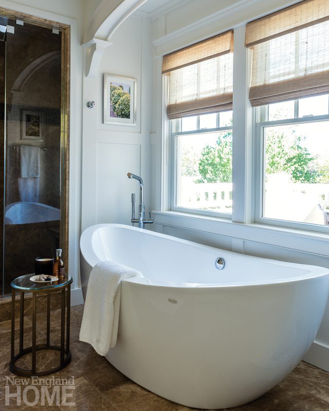 The king bed in the master bedroom was another large piece that made the journey across the cul-de-sac. Its placement necessitated some design gymnastics on the part of Sterling, who commissioned a pair of narrow night tables to accommodate the tight confines between a wall and window flanking the bed. A treasured chaise, on the other hand, was a perfect fit under the bedroom windows overlooking the river; a new chandelier enhances the room’s overall feeling of relaxed elegance.