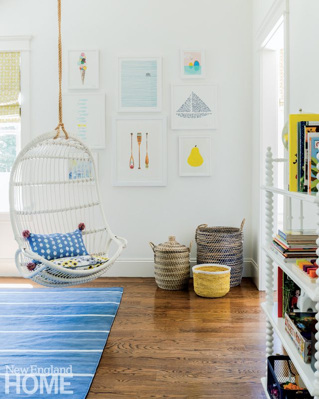 The bright and playful upstairs bedrooms were designed with the grandchildren in mind. Sterling eschewed custom beds and furnishings in favor of durable and economical off-the-shelf choices in a room where fun, not fashion, reigns supreme. The grandkids get matching beds in gender-neutral colors, but rock-paper-scissors decides who gets to nestle with a book in the solo swing chair.