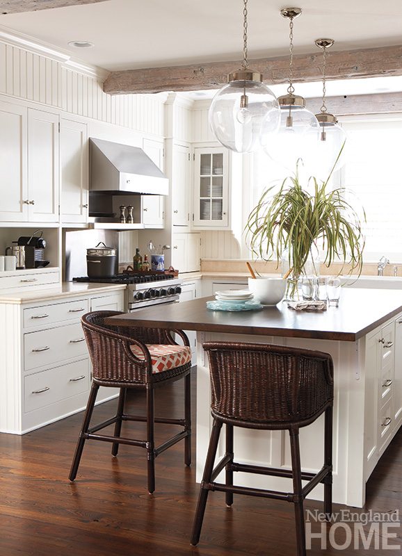 Proportion partnered with practicality in Hay’s determination that the center island in the kitchen needed to be larger. “By stretching it out we achieved a more balanced look, visually, plus are able to accommodate four stools,” she says. Hay suspended three glass globe lights from the Nantucket Lightshop over the re-configured island.
