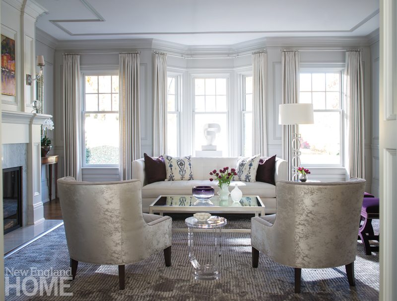 The painting hangs in the living room above the fireplace between crystal sconces. Walls of gray and white serve as a soft backdrop for the painting and for a mix of traditional and transitional pieces. The husband’s desire for color shows up in a pair of purple velvet ottomans, while the more neutral rug, sofa, and silver-backed armchairs speak more to the wife’s style. A white marble sculpture found through the New Canaan gallery of Heather Gaudio, who helped with a number of art pieces in the house, sits squarely in the window facing the driveway.
