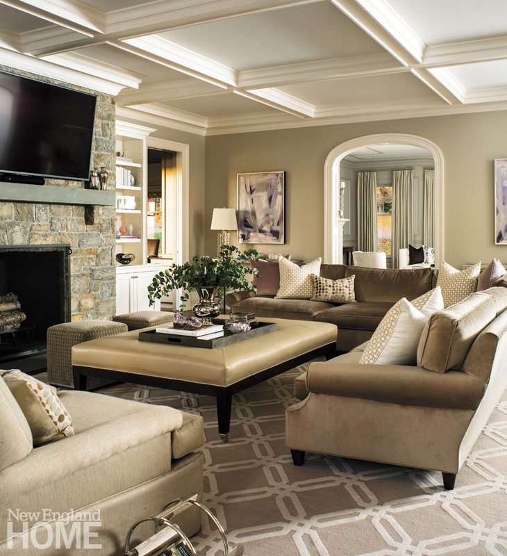 The family room—with its taupe walls, tan sectional sofa, and coffee table topped with caramel-hued leather—stands in soothing counterpoint to the bold dining room. Cafe au lait colors wash the entire room, save for a pair of paintings in lavenders on either side of the archway that leads to the living room.