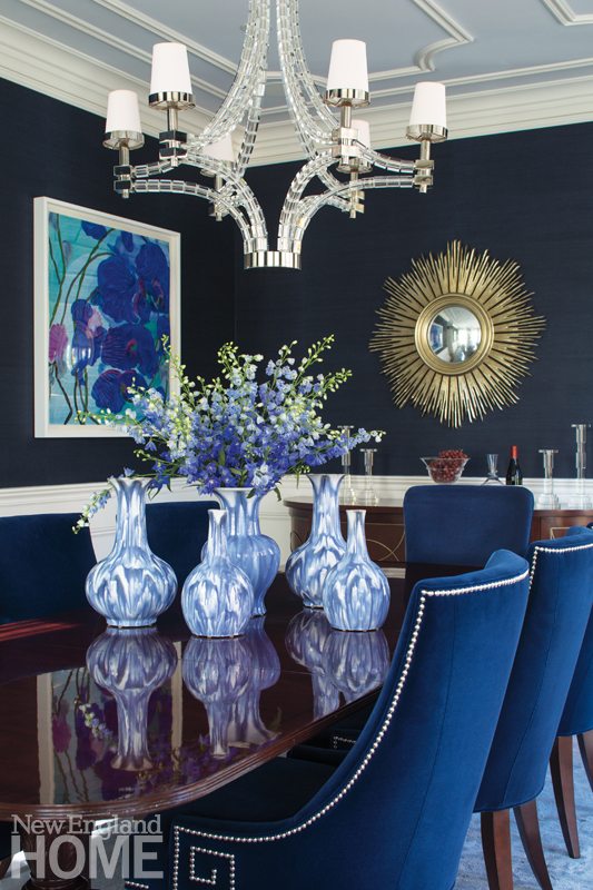 On the other side of the foyer, bold color takes over in the dining room, with dark-blue grasscloth, blue-velvet chairs, and a pair of paintings that erupt with purples and blues. Simple white sheers with a horizontal stripe of silver hang from ceiling to floor, and a rich blue rug in a lighter shade covers the floor. Gaudio helped the couple select the paintings, by Jasmina Danowski, Morgan Harrison explains. “They are feminine, yet bold and fluid—a perfect blend of the couple’s styles,” she says.