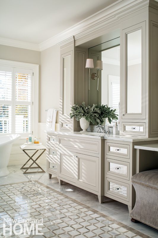 Upstairs, the master suite shares that view. Creamy silk drapes hang in the bedroom against walls that have just a whisper of lavender. Save for a headboard of dark velvet, everything is the color of heavy cream. In the master bath, Morgan Harrison found a place for the wife’s favorite tile, using it as a mosaic covering for the floor. Mirrors accent the panels of the light-gray cabinets.