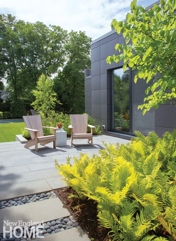 The landscape follows suit in terms of sustainability, with low maintenance, mostly native plantings, and a durable hardscape; the terraces and walkways are bluestone, and the planters are poured-in-place concrete. Landscape architect deNiord says his primary goal was to introduce texture, seasonal color (flowering plants bring in a palette of purples and blues), and an edible aspect; to fulfill the latter, he planted blueberries and serviceberries. His aesthetic, in keeping with the house, is decidedly modern. No visible nods to the past here. In fact, deNiord even forwent including a pear tree. •