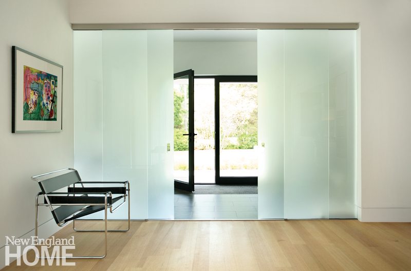 The architect also broke with convention when it came to siting the house. In order to capitalize on the southern sun and to foster the strong indoor-outdoor connection, the house opens wide to the side yard. To create privacy, Horowitz positioned the detached garage in such a way as to box in that side area. She sliced in half the existing tennis court, in the backyard, converting it into a play court that can be flooded for ice skating when temperatures dip.