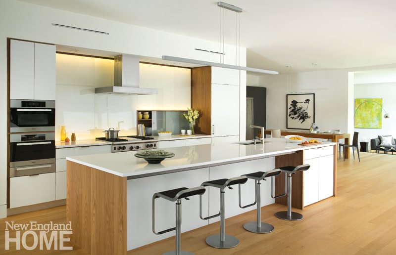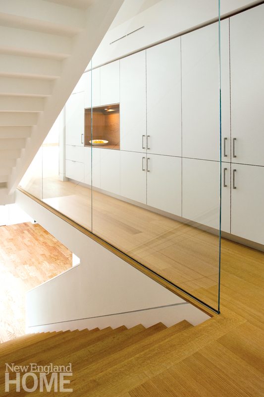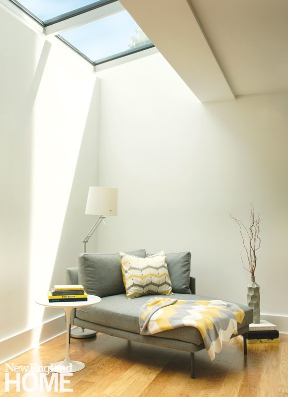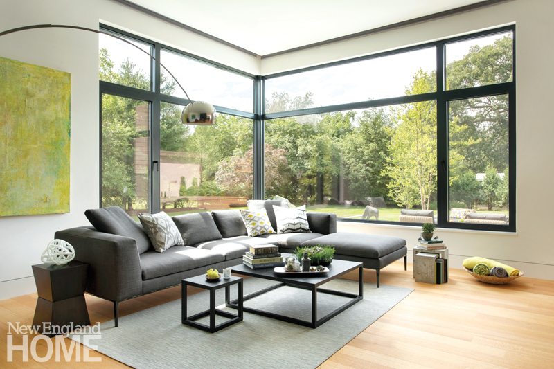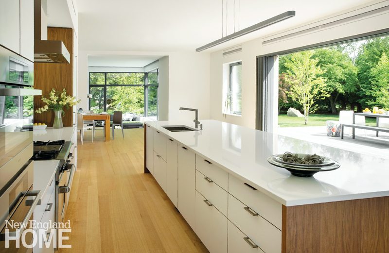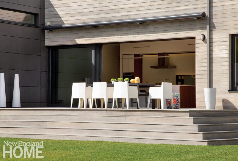 The 4,400-square-foot, four-bedroom home may not resemble its neighbors, but Horowitz did take pains to ensure that the exterior material palette nods to the New England vernacular, opting for pine shiplap board siding, stucco, and fiber cement in muted tones. Keeping sustain ability and durability in mind, there’s nothing to be painted, stained, or treated. “We want it to age gracefully,” Horowitz says. The job was right up the alley of builder Matthew Ayers, principal of the Waltham, Massachusetts-based company Aedi Construction, a firm noted for its commitment to green building practices.