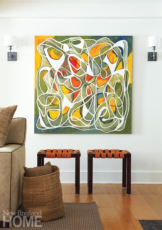 The homeowners are also great advocates of the arts and wanted work by local artists, says the designer. A favorite painting—a bold, broad-strokes work by Steve W. Miller, who has homes in New York City and Kent—hangs in the living room.