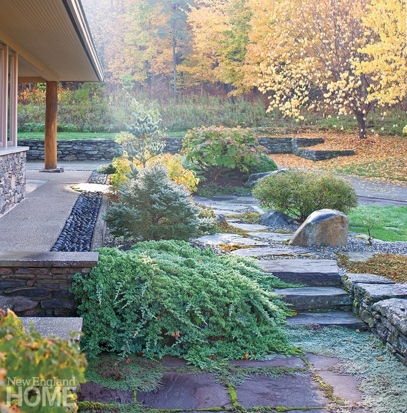 In addition, Knauf’s deft mix of a variety of stone and plant materials enhances the architecture at every turn while providing year-round interest, another of the owners’ priorities. “Winters are long,” Knauf says with a laugh. To that end, she limited the number of ornamentals and looked to native plants that are found in Japanese gardens but also speak to the flora of north central Vermont.