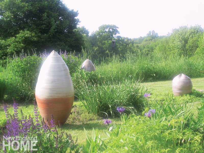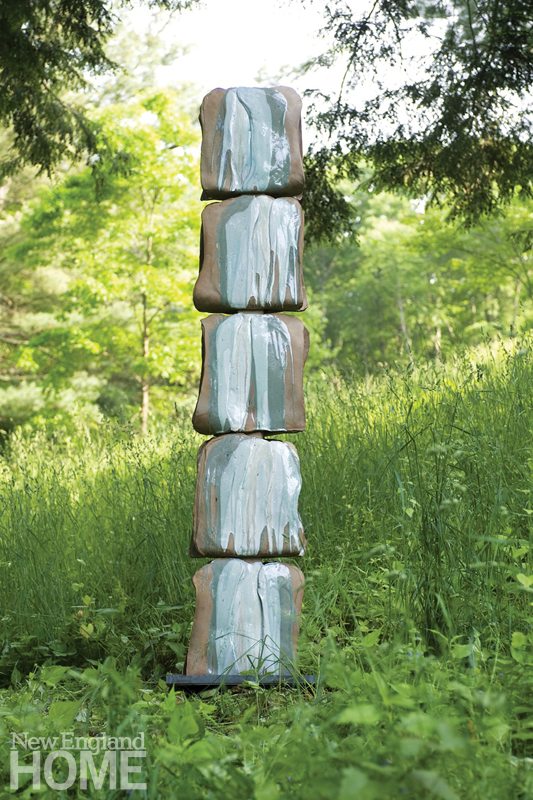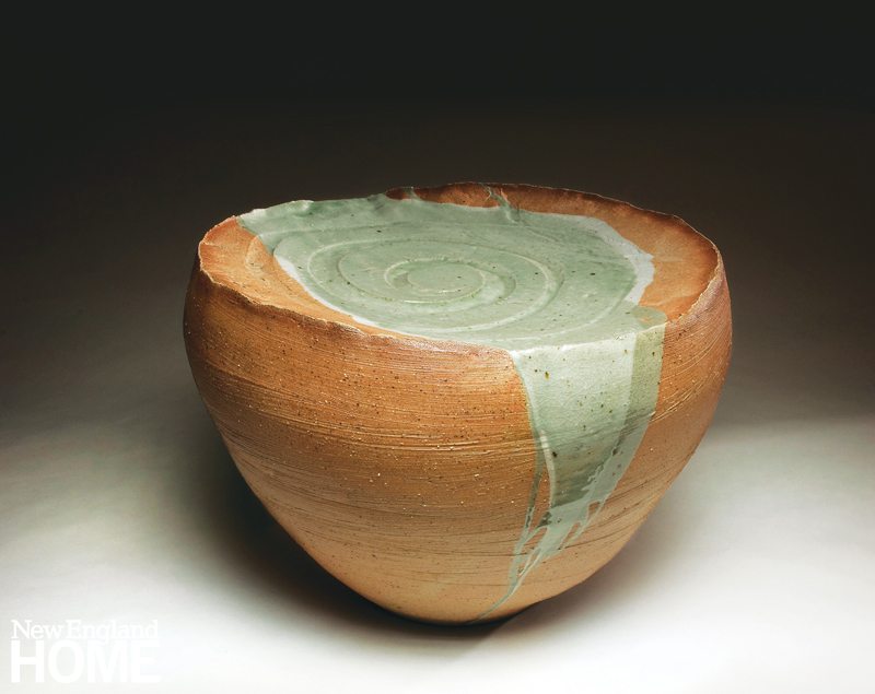 When observed as a whole, Mallory’s body of work exists on a timeless, otherworldly plane that’s both sensual in form and tactility and chaste in meaning and function. The unique forms seem vaguely familiar, too, and range from small, globular, hollowed-out, wire-wrapped clay entities she calls Bundles to totem-like four- and five-foot vertical Standing Stones composed of separate cube-like shapes mounted on welded steel bases. Mallory blends all her own glazes, composed of a measured mix of silica (which determines the sheen of each piece) and naturally occurring oxides (for pigment), and often uses sifted fireplace ash for added texture and color, begetting yet another “very Asian sensibility,” she says.