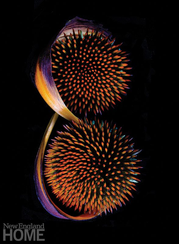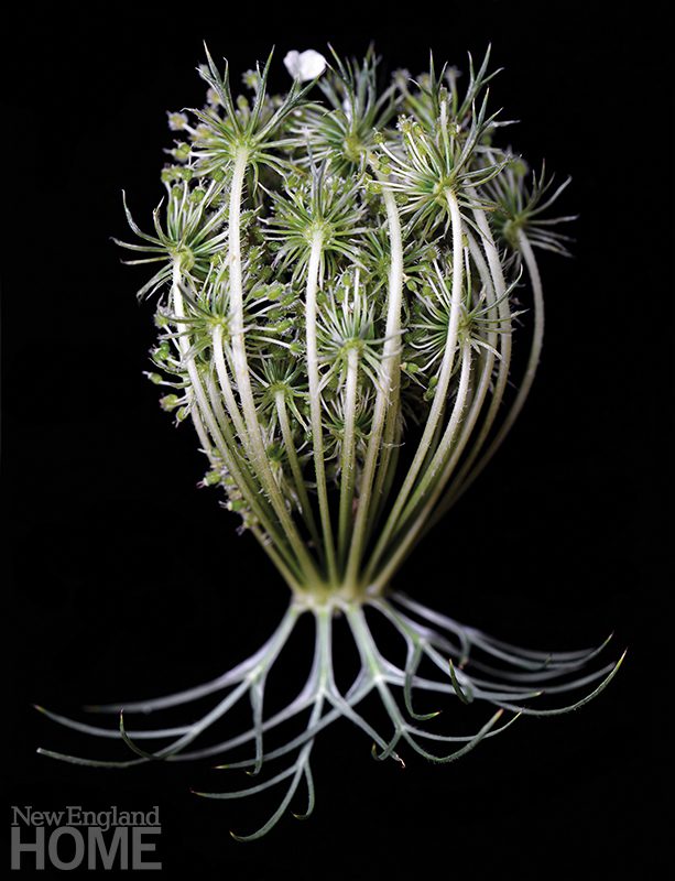 Then spring came to Western Massachusetts, and Kirkwood resumed her walks in the meadows and the woods of Amherst, collecting milkweed pods and Queen Anne’s lace. As she smelled, arranged, and combined the debris from both landscapes, she gradually decided to photograph like objects rather than mixing disparate ones. “I kept thinking about monuments,” she says. “Simplistic, reductive, they distill an idea into a form and convey something essential about that place.”