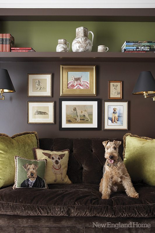 In the kitchen and family room, everyone’s favorite place to spend time, Della Monica fostered a countrified air by transforming the previously bright-colored space with walls painted Benjamin Moore’s Briarwood, a shade that fluctuates between gray and olive green with the day’s passing, and a custom-stained maple floor. Two beefy ceiling beams were installed, making the spacious kitchen feel more warm and inviting.