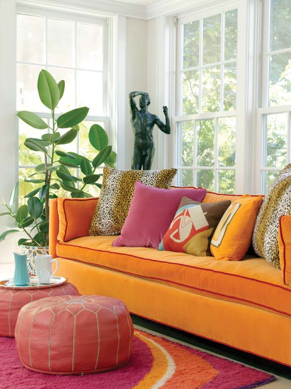 Gallipoli launched her design plan by painting the whole house off-white. Those stark walls became the perfect blank canvas for showcasing her unconventional sensibilities. In a space off the family room, a photograph by Sally Mann hangs above the fireplace between busts of her children that she commissioned from Connecticut artist David Boyajian. Flanking the fireplace are six feet of books wedged into Sapien bookshelves. The living room, dominated by an enormous Buddha and a large Charles Hollis Jones Lucite table covered with a collection of sterling silver boxes, appears staid in comparison with the sunroom and its riot of sunburst colors. On one side of the window-walled room a squash-colored sofa piped in red holds a slew of colorful pillows, including one by Jonathan Adler embroidered with the Studio 54 logo. Two prototype chairs by the Danish designer Hans Wegner sit opposite in an eye-popping David Hicks pattern. A vibrant rug accents the furniture, along with a pair of hot pink Moroccan poufs, which Gallipoli sells at the store in the more subdued shades of white, silver and gold.