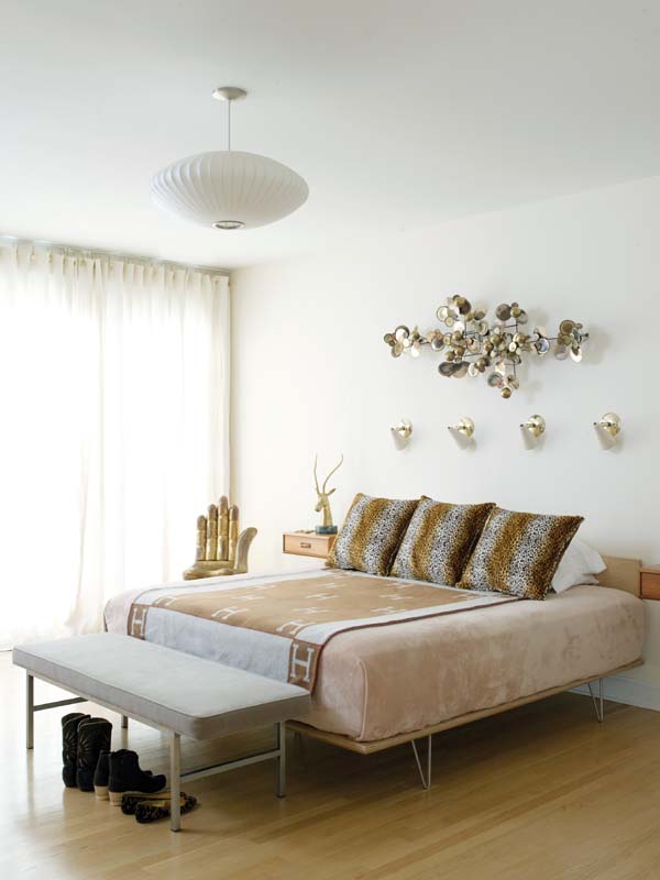 Other rooms, such as the all-white kitchen and breakfast area and the neutral-hued master suite, stand in serene contrast. In the bedroom, Gallipoli played up the simplicity of the wood-and-metal Eames bed by keeping the bedding sleek. Legless nightstands protrude from the wall while a Curtis Jeré rain sculpture takes flight on the wall above the bed. The simple sheer curtains are the only ones in the house. The iconic hand chair by Pedro Friedeberg was another of her finds.