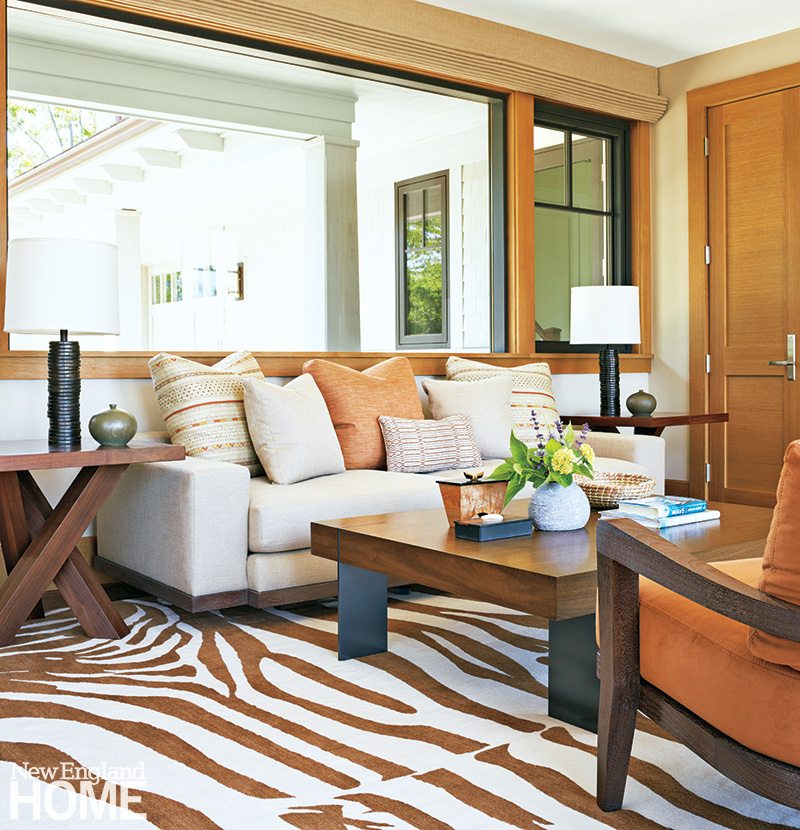 The tailored furnishings are comfortable for everyday living and entertaining, but they’re also undeniably stylish. The spacious home incorporates a number of relaxing spaces, and Hedges has ensured each is as chic as the next. The den, with its graphic zebra-striped rug, is particularly seductive. Visitors are quick to imagine themselves whiling away the hours on the pillow-strewn sofa—at least until they spy the sunroom. This bright space opens to the pool on the south, while a parade of floor-to-ceiling windows to the east frames the harbor. Reading? Catnapping? A pair of welcoming divans perched side by side invite leisure.