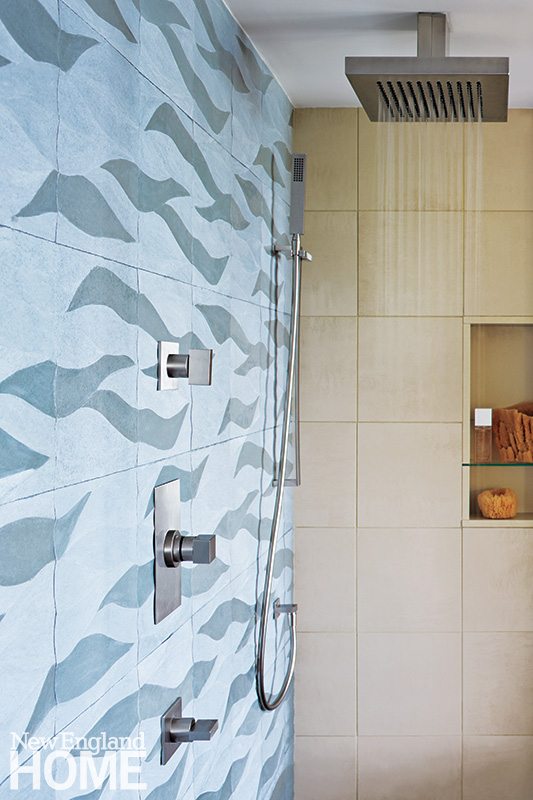 When the owners slip away for a few private moments, it’s to a posh, Zen-like master suite. “I decorate with the idea in mind that I want the room to look as good ten years on as it does right now,” says Hedges. The wide, upholstered floating headboard, behind which is tucked the entrance to the walk-in closet, is her design. The room’s serene color scheme flows into the master bath, where the gray-blue shower tile mimics the ocean.