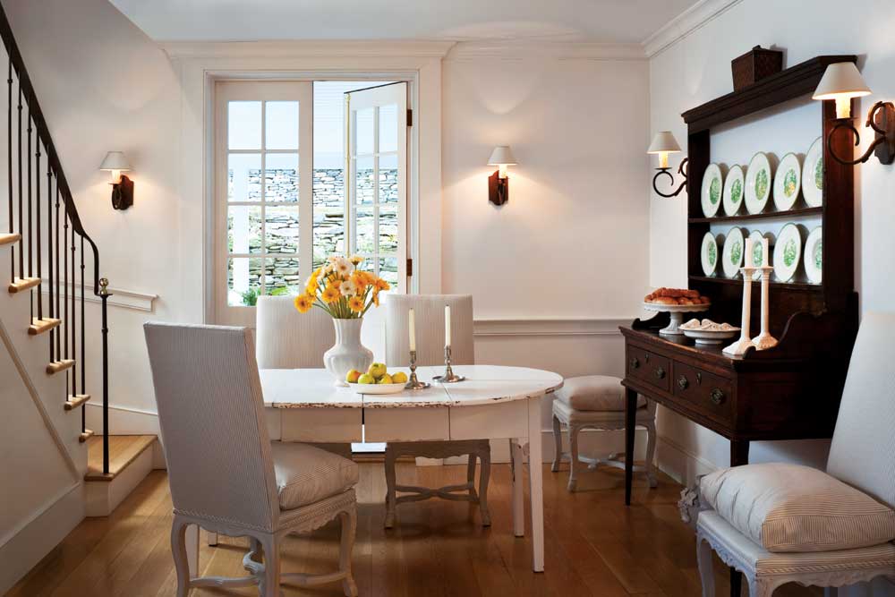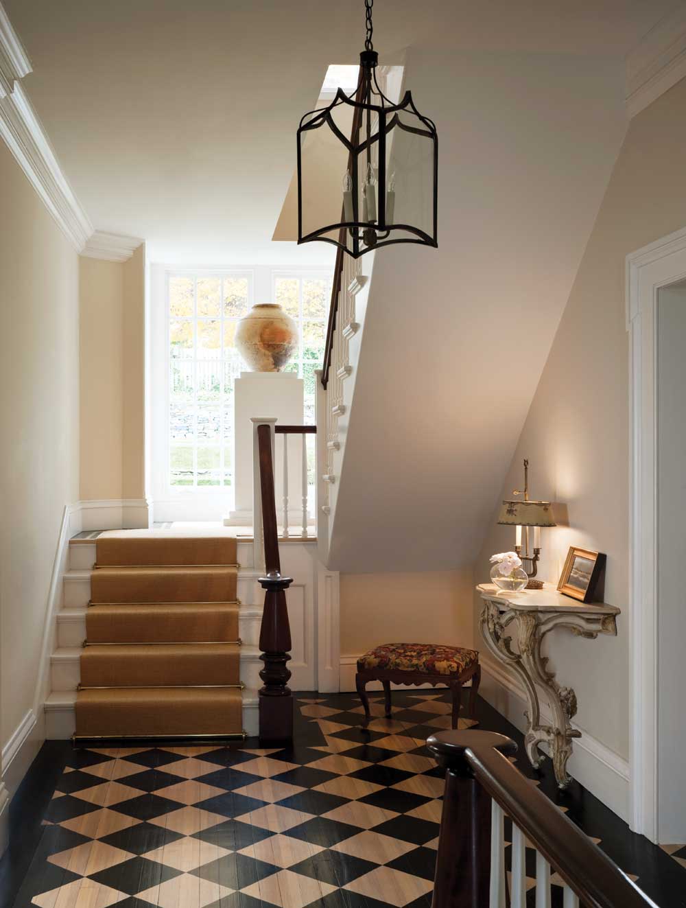 Spada reversed the direction of the staircase, expanding the gracious feel of the foyer while adding a hint of intrigue by giving visitors a framed view of the garden outside. Walls were redone in plaster, woodwork painted in white with a perfect sheen.