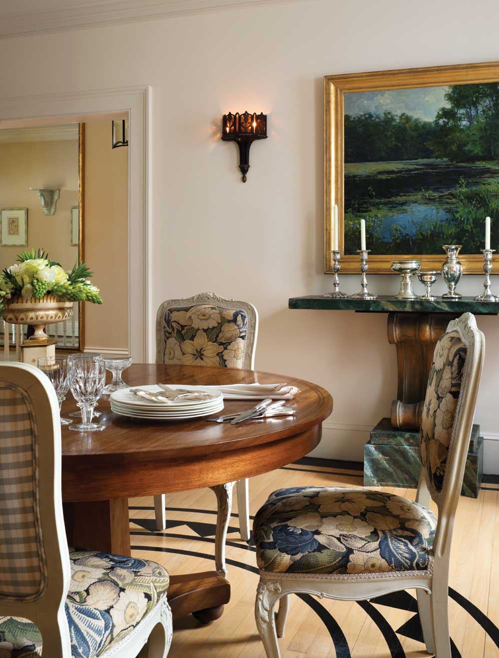 That said, the library, painted the color of a ready-to-pick French string bean during the original renovation, retains its vibrant hue. There was no sense in meddling with it. New curtains in Italian silk hang at the windows. The dining room floor, painted to look like period inlay, was repainted in the same fashion, as was the checkerboard-painted floor in the foyer in front of the staircase.