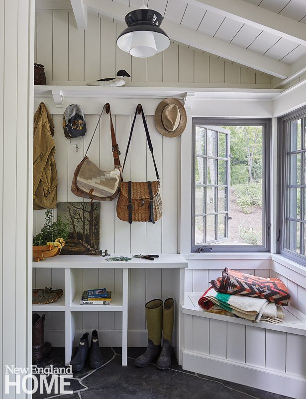 Pat sums up the couple’s vision succinctly: “We wanted a lake lodge that blended into its surroundings and complemented the property.” Imber and project manager Mac White obliged with a 4,250-square-foot house inspired by old coastal camps. On approach it reads as an intimate single-story house clad in white-cedar shakes with a low-slung roof. On the lakeside, the lower-level walk-out fabricated with stone excavated from the site hunkers into the hillside. Inside, exposed reclaimed oak and ash timber framing, butternut walls, and local-stone flooring in the foyer reinforce the aesthetic.