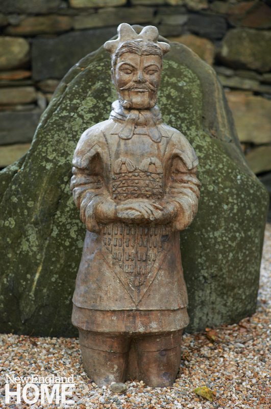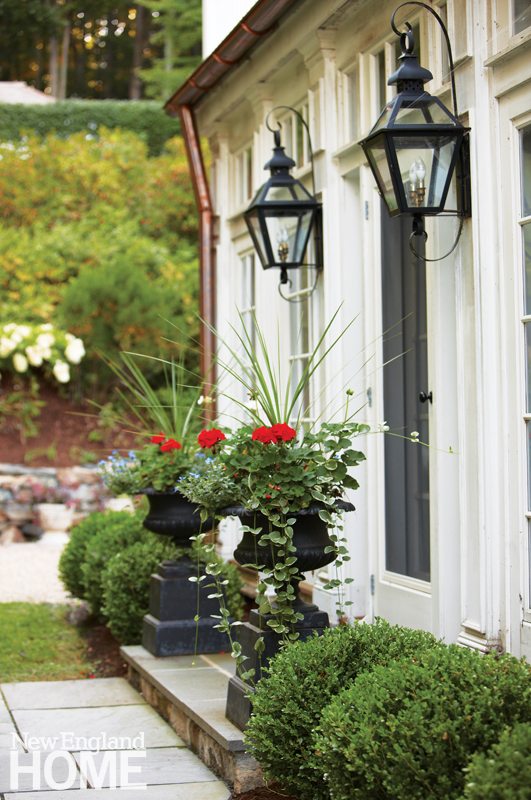 Tucked into a hill, the vertical barn lacked a proper entry. The main access to the building was down the service driveway in back and through, of all places, the laundry room. James enlisted landscape designer Jeff Stevens, owner of New Milford’s Meadowbrook Gardens, to devise a whole new approach to the house. Stevens designed an upper driveway that winds down to a romantic pergola. From there, a path of bluestone leads to a welcoming entry forged from what was once a dairy room. His spectacular solution changed the tenor of the place, giving it a warm, hospitable new feel.
