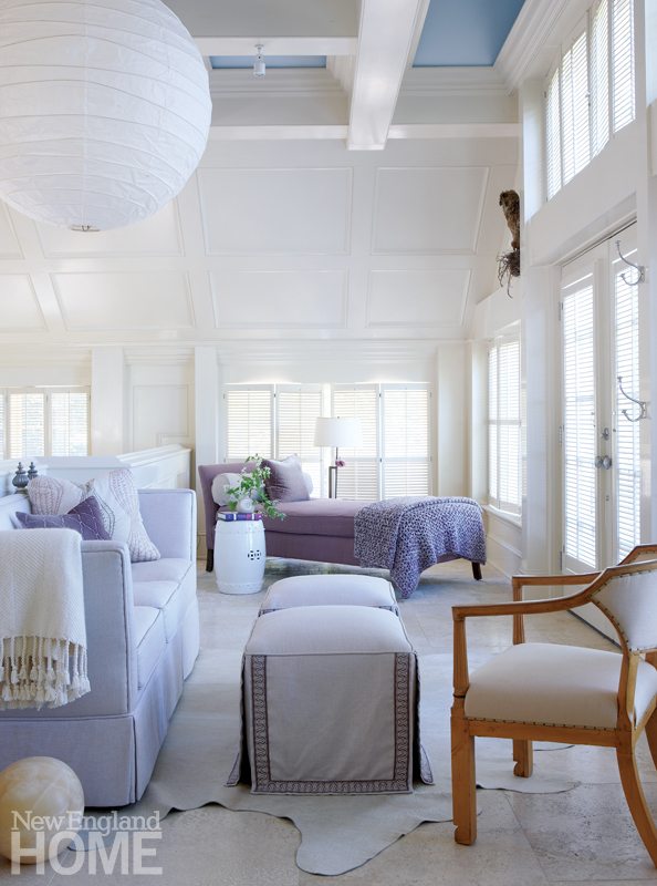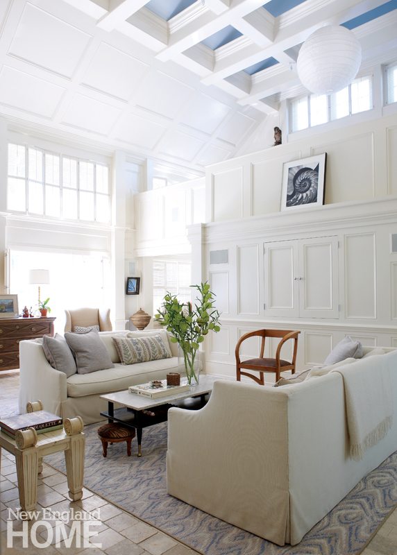 The airy living room is located around the corner. Its stellar thirty-five-foot ceiling incorporates photosensitive panels that change color as the day wanes. An art installation left behind by previous owners, the panels appear robin-egg blue when the sun shines then fade to pink, bathing the room in a dreamy glow. As fabulous as it is, such a light show could be potentially problematic for decor. Yet Quinn’s smartly curated, neutral approach welcomes the drama. The twin sofas clad in a pale indoor/outdoor fabric— “again for harmony with the floors,” she says—take everything in stride. A gorgeous marble fireplace dominates one end of the room, while at the other end, a paneled wall conceals the television. Another trip to Privet House yielded the side tables, gilt lamps, and an architectural wooden bench. A personality-filled foot stool and an antique side chair were mined from James’s amazing stash.