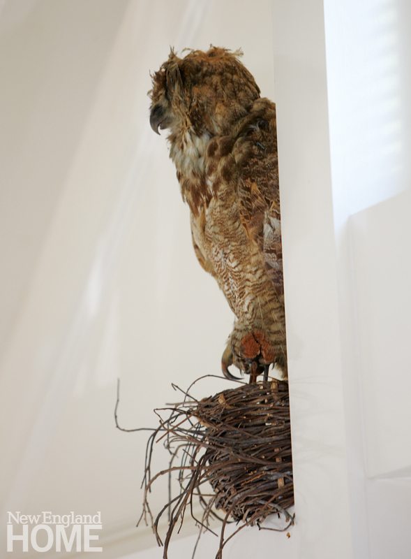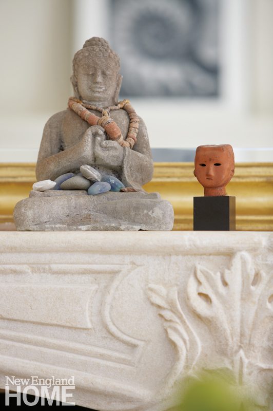 Quinn moved at breakneck speed to brighten the interior. She began by painting most walls her favored formula (a fifty-fifty mix of Benjamin Moore’s Linen White and White) to complement the existing stone floors. Much of the furniture was cherry-picked from the owner’s impressive collection of pieces gathered over the years and stored in an arsenal of sheds. Other pieces came from sources far and near. The deft mix of eras and styles—augmented with the owner’s art and treasures gleaned from all over the globe, including a cache of pre-Columbian artifacts—works like a tonic, enlivening the quirky building to its core with a modern sensibility. “I call it traveled contemporary,” says James.