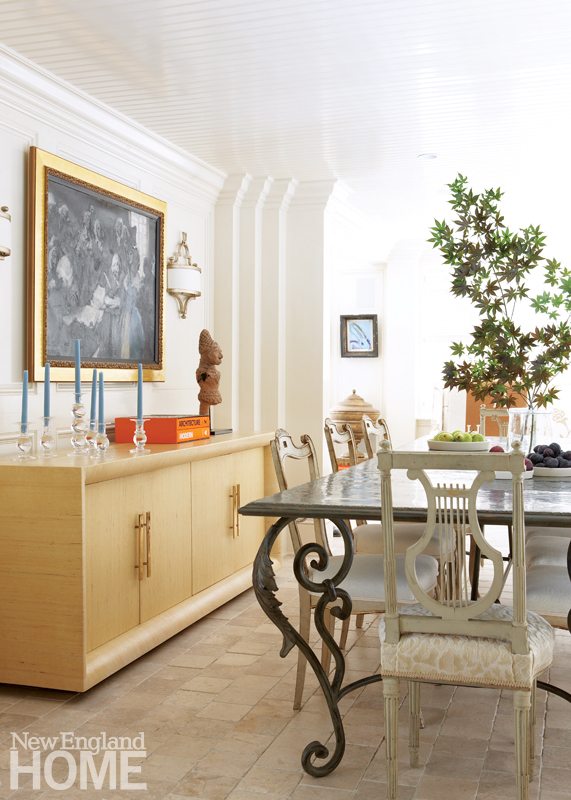 The window-lined dairy-room-turned-entry contains an Ochre chandelier and a vintage mirror from Privet House in nearby New Preston. There’s a Restoration Hardware chaise for lounging and a gleaming table where James can plunk her keys. Paired with an upholstered settee brought north from Tara Shaw Antiques in New Orleans, the table can double as a picturesque spot for dinner.