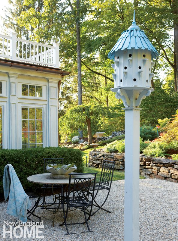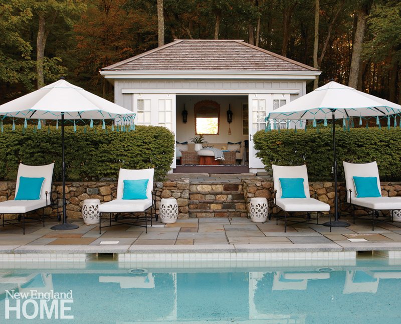 From her bedroom, the owner slips out to a meditation garden to decompress. There’s also a graveled terrace with a small table promoting meals or, at least, a glass of wine (the table’s centerpiece is contrived to hold ice and bottles). When James zips up the hill in her golf cart, there sits the pool and the rejuvenated pool house. The latter, with its charming ottoman and carved mirror, is as chic as the renovated barn. As part of his landscape program, Stevens removed trees and an overgrown hedge along the existing pool to “open things up and let in the light.”